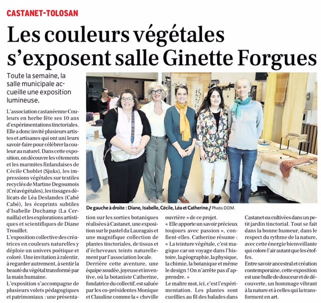 Couleurs en herbe est une association de découverte des plantes locales et des couleurs naturelles, implantée dans le sud-est toulousain. Nous proposons des sorties botaniques, des ateliers pratiques, des conférences autour des plantes à couleurs (encres et peintures naturelles, teintures végétales, impressions….) et des animations lors de manifestations autour des plantes.